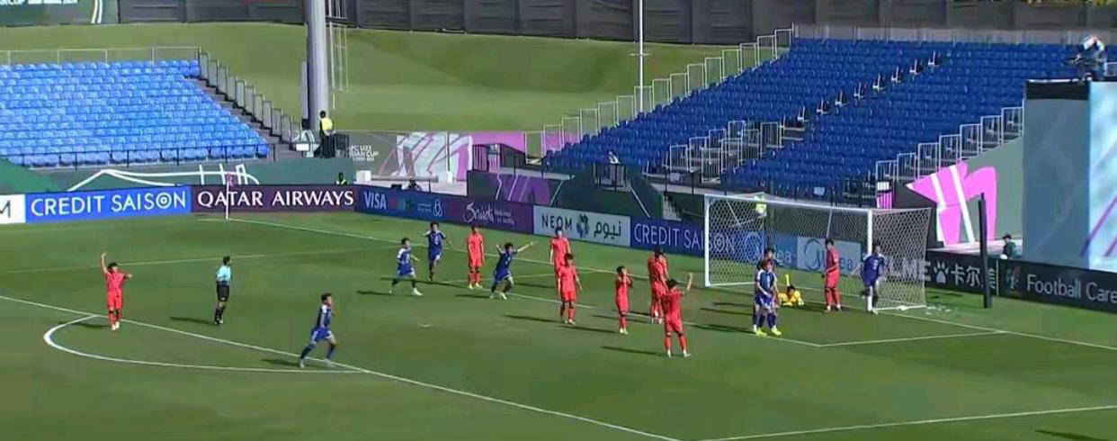 比赛一开始,双方即刻进入高强度对抗,无丝毫试探,场面异常紧张。每一次拼抢都伴随着激烈的身体接触,气氛高度紧绷。上半场双方攻防转换频繁,但比分始终未能改写。日本队在整体节奏上稍占优势,尤其是前锋道协丰表现活跃,多次创造单刀机会。然而面对老对手,他显然压力巨大,两次关键射门均无功而返,遗憾错失得分良机。