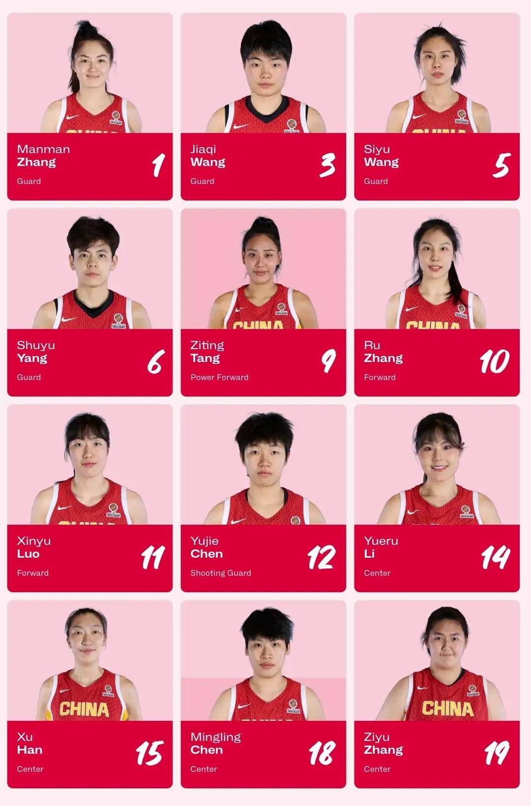 目前,中国女篮的12人大名单已出炉,在海外联赛效力的两大中锋韩旭、李月汝回归,与“小巨人”张子宇组成强力内线名参赛队员为张曼曼、王佳琦、王思雨、杨舒予、唐子婷、张茹、罗欣棫、陈玉婕、李月汝、韩旭、陈明伶、张子宇。