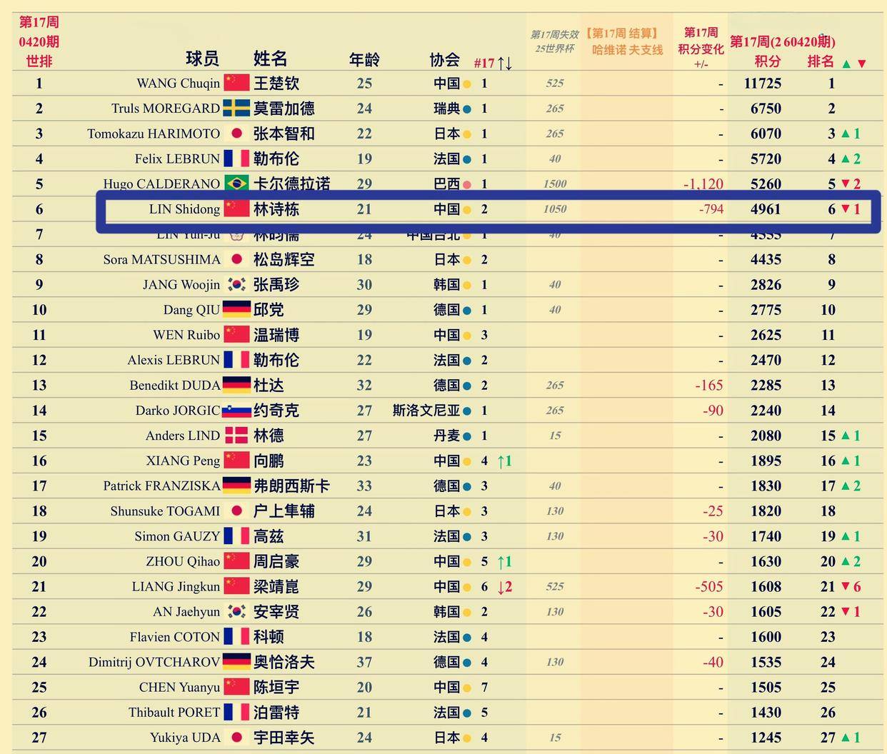 与此同时,国际乒联在4月20日公布了2026年第17周的最新世界排名。 这份榜单因为去年澳门世界杯的积分到期,引发了一场“大地震”。