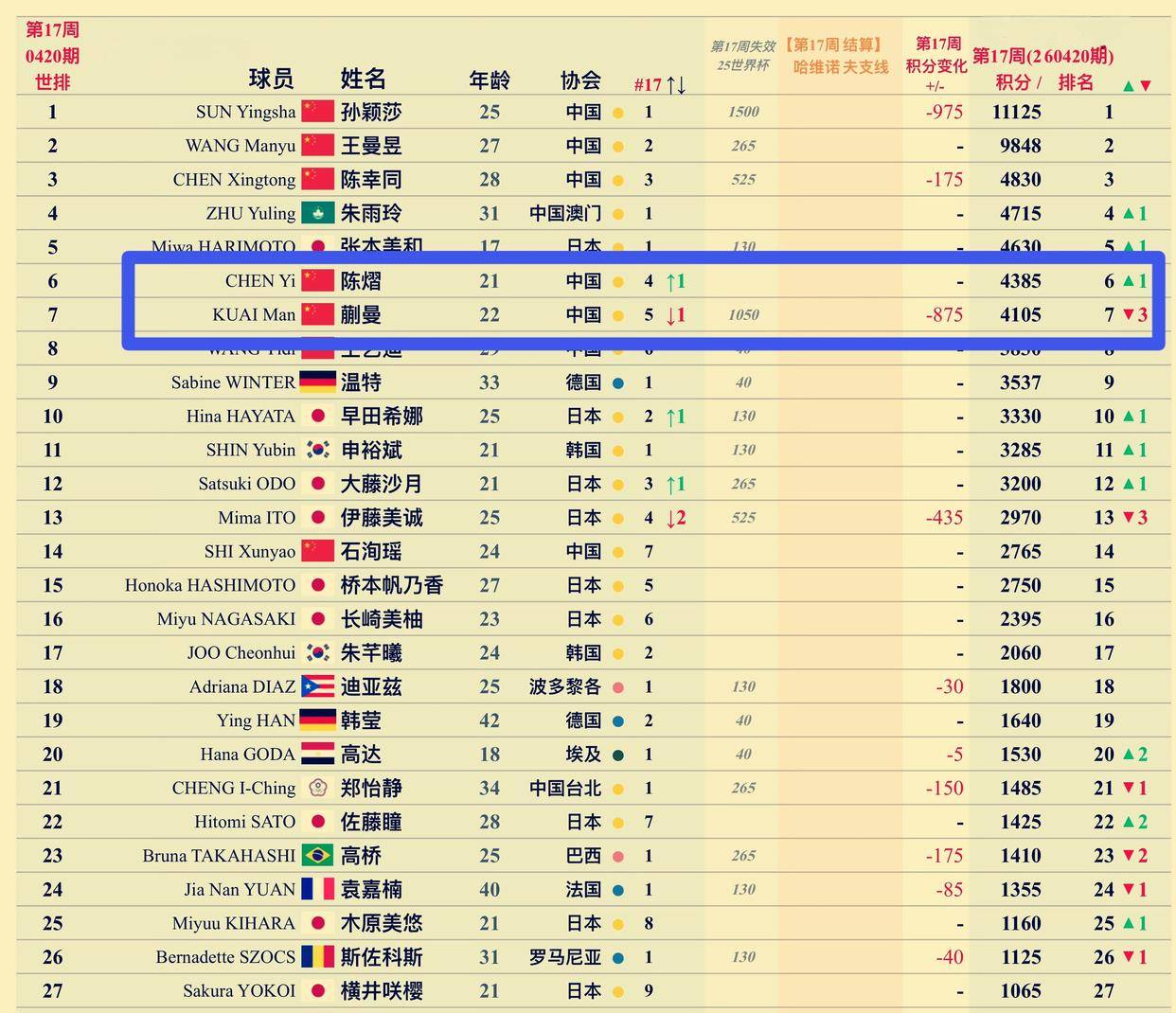 取而代之升至第六位的,是她的队友陈熠。 陈熠借此创造了个人职业生涯的排名新高,并一举超越了蒯曼,成为国乒女队新的“四姐”。