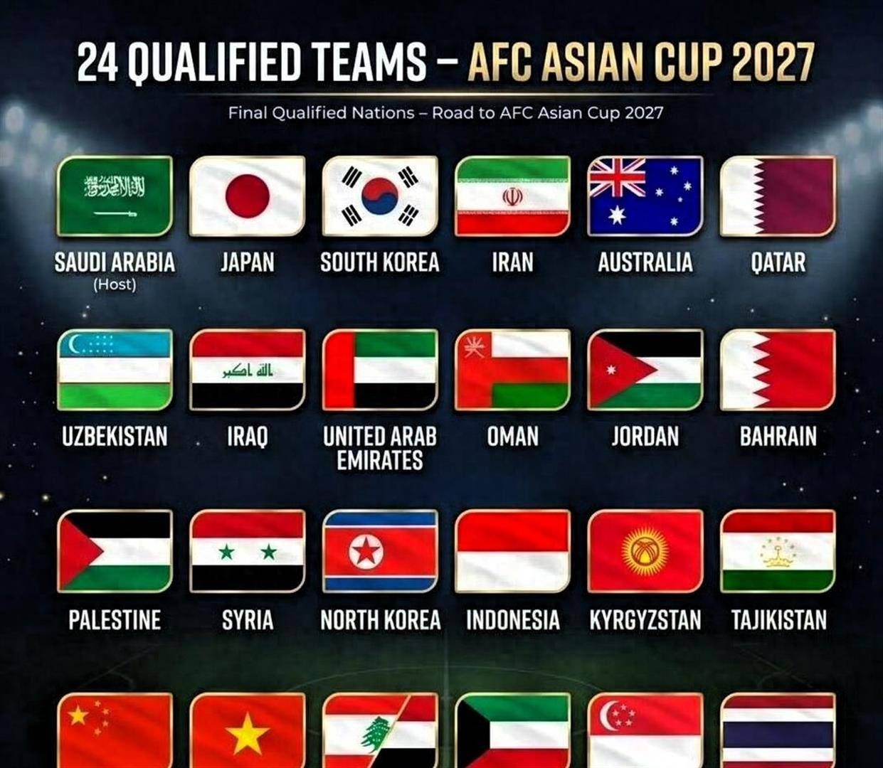 根据亚足联官方消息,本届亚洲杯正赛将于2027年1月7日至2月5日在沙特的利雅得、吉达和胡拜尔三座城市举行。 目前,24个参赛席位已确定23席,最后一个名额将在2026年6月4日由黎巴嫩和也门通过附加赛决出。