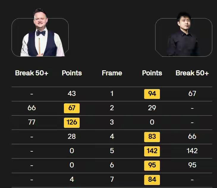 从整体数据看,赵心童的表现极具统治力全场贡献两杆破百以及三杆50+,进攻效率惊人,尤其是单杆142分的高分更是全场最高,完美展现其围球技术和连续得分能力。相较之下,虽然墨菲也有单杆66分、77分的亮点,但面对赵心童连绵不断的攻势显得相形见绌。