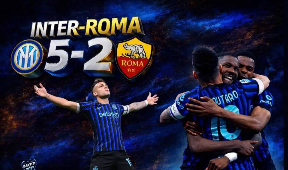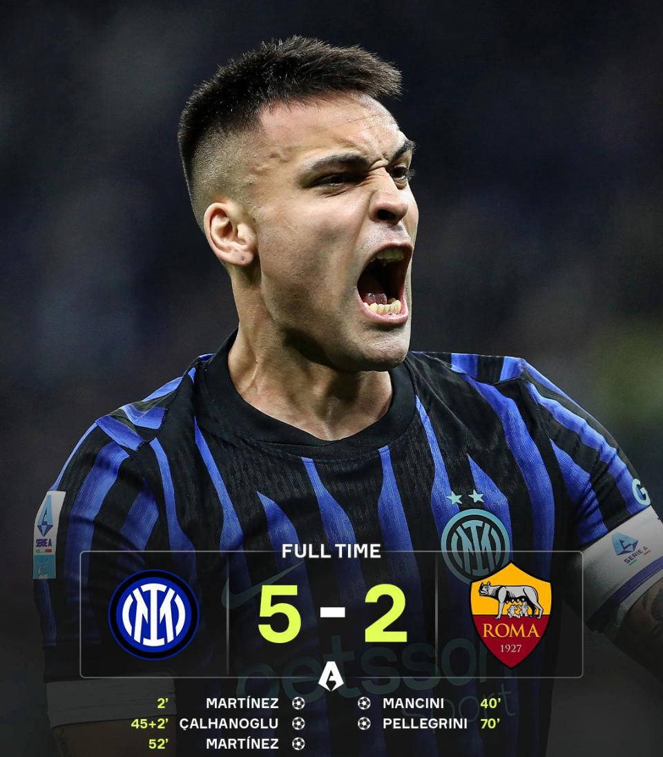 下半场继续进行,国米的表演才刚刚开始。第53分钟,图拉姆前场断球后将球传给劳塔罗,他轻松推射再下一城,将比分扩大到3-1。短短几分钟后,国家足球超级联赛表现出色的恰尔汗奥卢又通过角球助攻图拉姆头槌破门,比分瞬间来到4-1。第63分钟,罗马后防失误频频,巴雷拉轻松推射得手,国米迅速扩大比分至5-1,比赛失去了悬念。尽管佩莱格里尼在第71分钟为罗马扳回一球,但最终的比分定格在5-2。此役后,国米在先赛一局的情况下,领先AC米兰9分,将竞争压力完全施加在了身后追赶者身上。值得一提的是,梅开二度的劳塔罗,已将个人进球数提升至173球,超越博宁塞尼亚跻身队史射手榜第三位,仅次于梅阿查和阿尔托贝利。