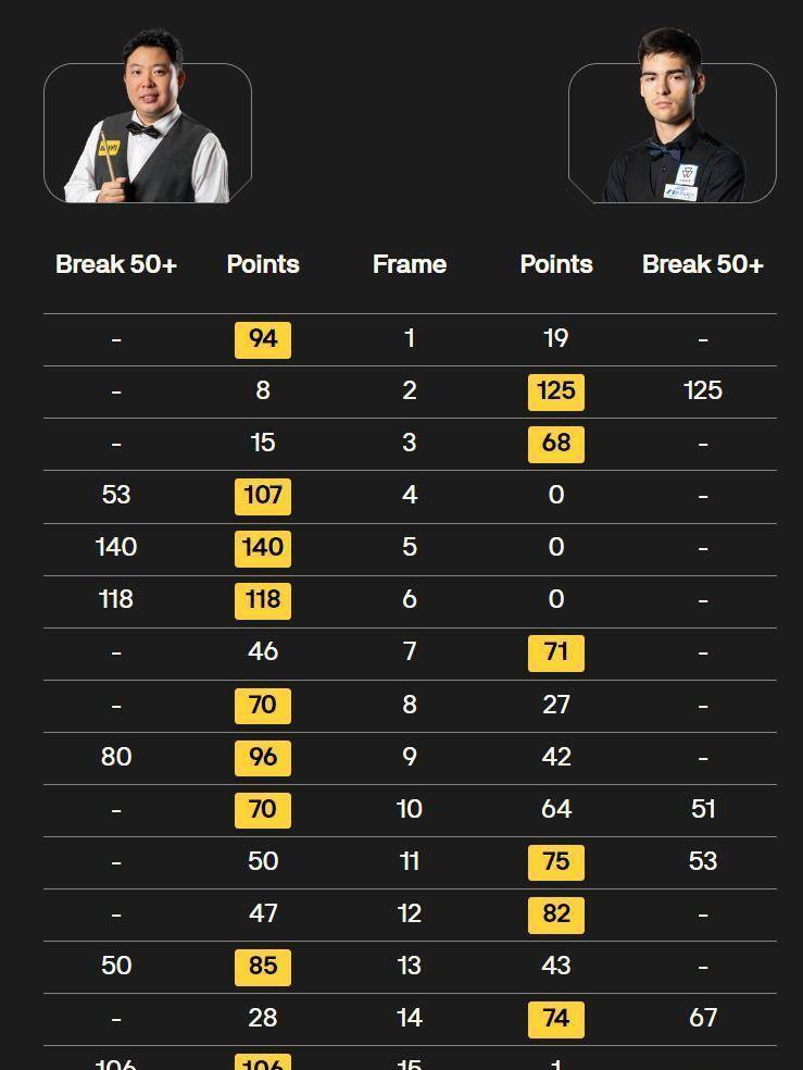 下半场开始后,雷佩凡的状态依旧火热。 第十局他打出了单杆119分的破百表现,第十一局虽然打出了53分却被布朗以单杆65分逆转,但雷佩凡很快调整过来。 第十二局他打出单杆63分以79-40获胜,第十三局又以单杆60分65-21拿下,比分来到了9-4。