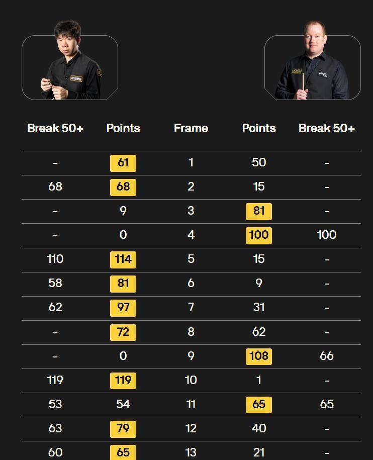 第十四局两人都有上手机会,最终布朗打出了单杆53分,但雷佩凡以80-57的比分获胜,最终以10-4的总比分晋级成功。 全场比赛雷佩凡打出了两杆破百和六杆50 ,而布朗只有一杆破百和三杆50 ,进攻火力的差距直接体现在了比分上。