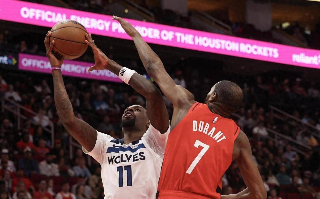 决定胜负的第四节到来。 火箭队没有给对手喘息的机会,他们一上来就祭出高强度防守,森林狼在3分钟内只靠罚球得到1分。 而火箭这边,申京仿佛觉醒,他连续在篮下强打戈贝尔得手,还送出一记妙传。 杜兰特则在外线分,这是他们全场最大的领先优势。 森林狼被迫叫出暂停。