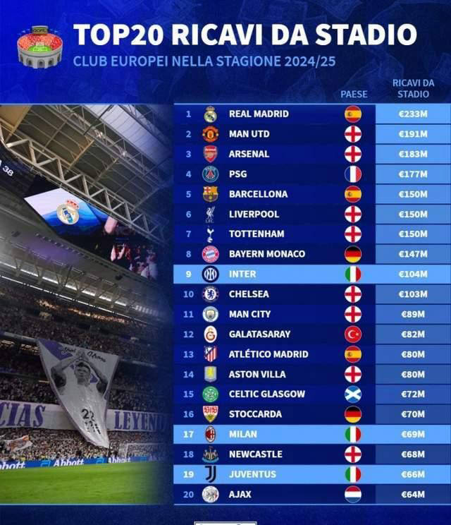 5. 德国转会市场公布了上赛季欧洲各大俱乐部的主场门票收入排名。皇家马德里以2.33亿欧元领跑榜单,曼联紧随其后攀升至1.91亿欧元,阿森纳以1.83亿欧元位列第三。此数据不仅反映了这些豪门俱乐部在商业运营上的巨大潜力,也侧面体现了其广泛的球迷基础和赛事号召能力。返回搜狐,查看更多