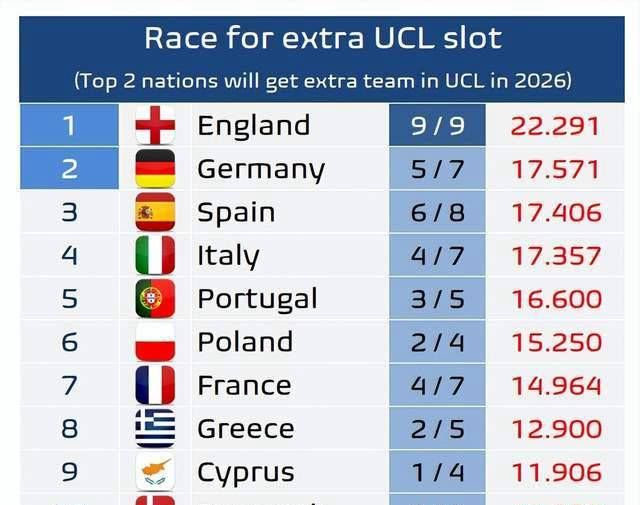 最后,从欧战系数排名来看,英超联赛以22.291分遥遥领先,在本赛季的欧洲赛事中表现尤为出色。英超共有九支球队挺进16强,显示出强大竞争力。相比之下,意甲战绩逊色,3支队伍不幸被淘汰,目前以17.357分名列第四位。德国和西甲分别排第二和第三,积分差距不大。本赛季欧战积分不仅影响球队参赛资格,还将决定未来几个赛季的名额分配,竞争异常激烈,势必引发各大联赛进一步加强自身阵容和实力。