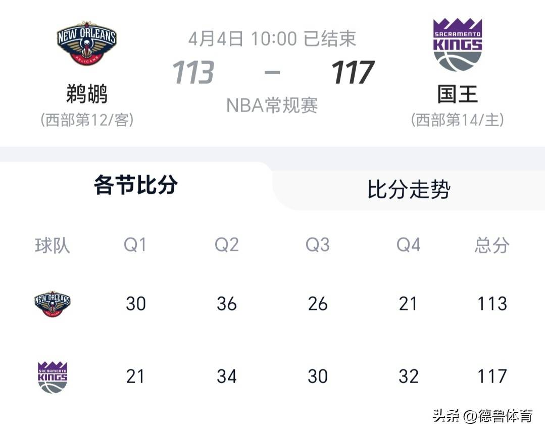 新奥尔良鹈鹕与萨克拉门托国王的西部卡位战则打得异常胶着。国王队的福克斯砍下27分5助攻,萨博尼斯贡献22分14篮板的两双数据,并在末节关键时刻命中罚球,稳定了局势。鹈鹕队的英格拉姆得到28分6篮板4助攻,麦科勒姆贡献23分,并在末节率队疯狂反扑,一度追平比分。双方在比赛中始终紧咬比分,分差从未超过10分。最终,国王凭借末节稳定的防守和罚球,以4分险胜,拿下二连胜,而鹈鹕则遭遇七连败,季后赛希望彻底破灭。