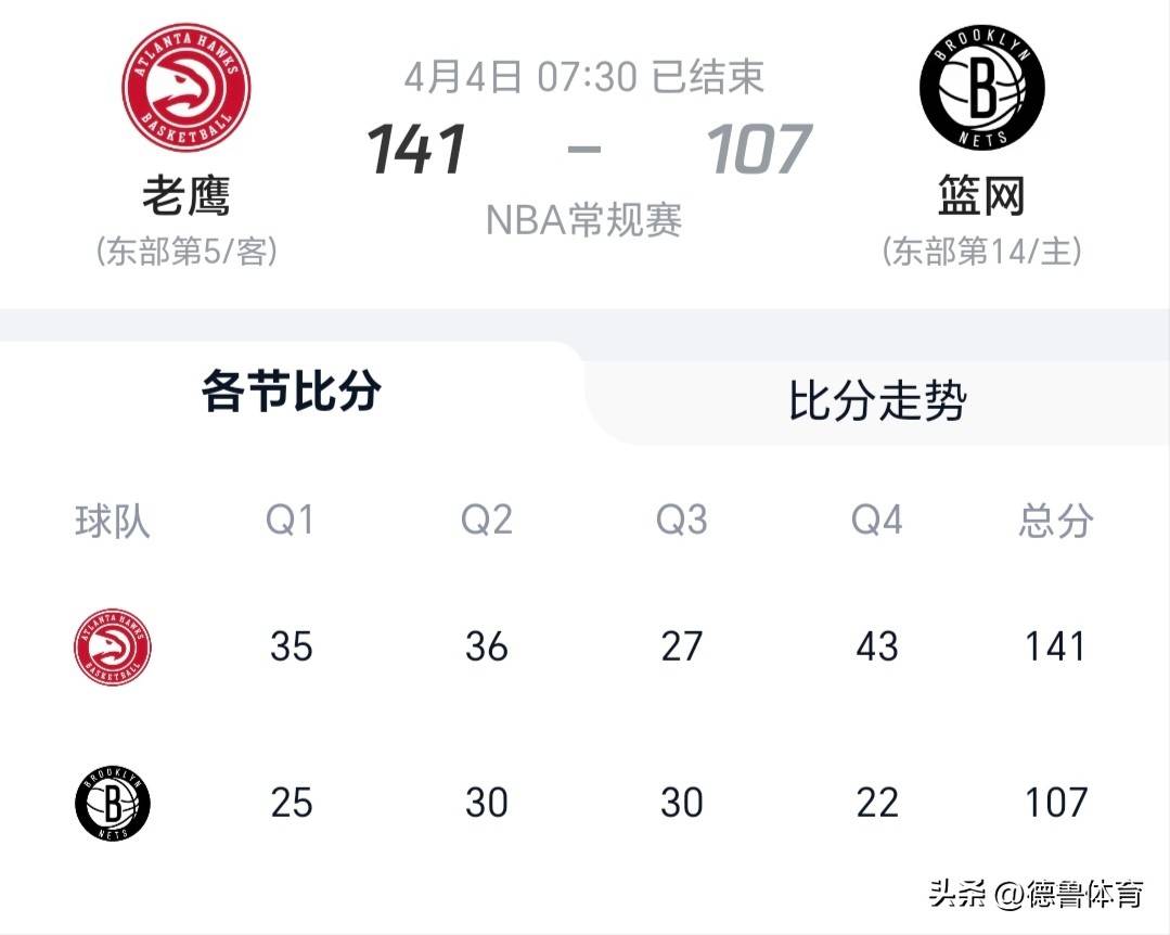 亚特兰大老鹰客场进攻火力全开,麦科勒姆带领全队七人得分上双,命中率超过55%,首节便将比赛打花,半场领先20分,让布鲁克林篮网的防守形同虚设。篮网队阵容残缺,核心球员缺阵,进攻完全断电,全场被老鹰队牵着鼻子走。老鹰队下半场持续发力,最终以34分狂胜,豪取四连胜,状态火热,而篮网队则在惨败中稳居东部垫底。