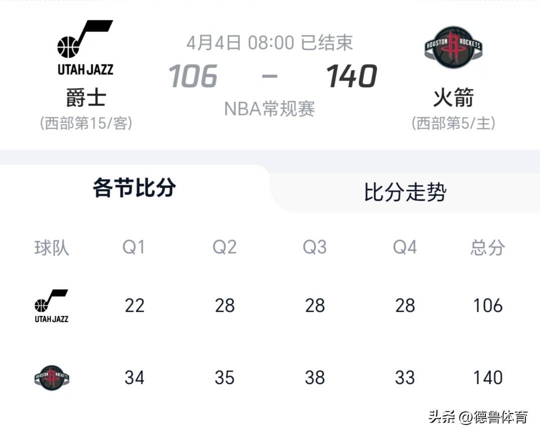 休斯顿火箭主场对阵犹他爵士的比赛中,火箭队全程压制对手。杜兰特高效砍下25分5篮板6助攻2盖帽,阿门汤普森贡献21分8篮板,科迪则得到27分11篮板的两双数据。火箭队首节便轰下34分,建立起领先优势,半场领先19分,下半场继续扩大分差。爵士队遭遇八连败,克拉克森和马尔卡宁的得分也难以阻挡球队的溃败,内线更是被火箭队彻底打爆。最终,火箭队以34分狂胜对手,豪取五连胜,稳居西部前列,全力冲击前三席位。