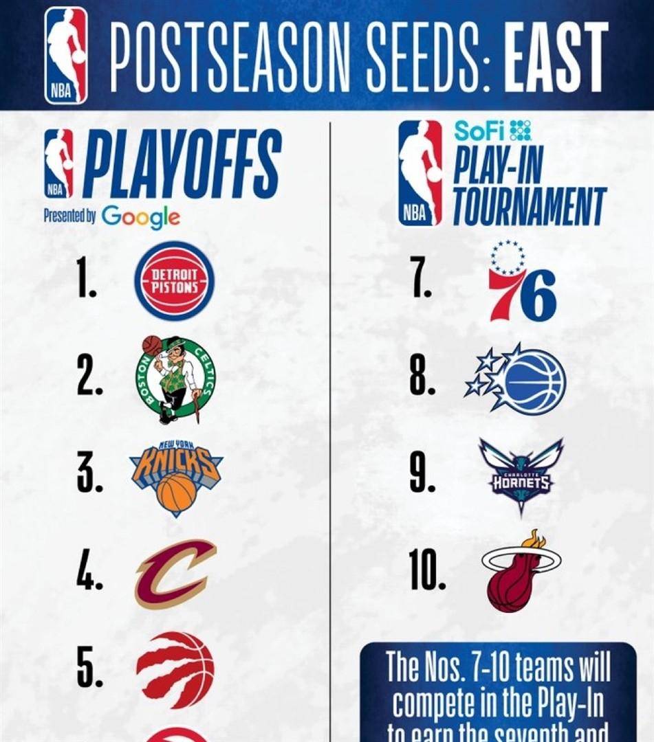转过头来看东部赛区,这里的排名同样充满了戏剧性的反转。 底特律活塞队一飞冲天,以东部第一的傲人战绩结束了常规赛。 谁能想到,这支在过去几个赛季一直徘徊在联盟底部的球队,通过选秀积累的年轻天赋终于迎来了集体井喷,他们在主场的胜率高的惊人,硬生生从群雄割据的东部杀出了一条血路。 波士顿凯尔特人队位居次席,作为卫冕冠军的他们整个赛季都打得稳扎稳打,随时准备在季后赛中再次展现统治力。 纽约尼克斯队和克利夫兰骑士队分列三、四位,尼克斯在休赛期引援的效果显著,而骑士队则依靠米切尔的出色发挥稳住了阵脚。 多伦多猛龙队和亚特兰大老鹰队排在第五和第六,顺利拿到了季后赛的门票。